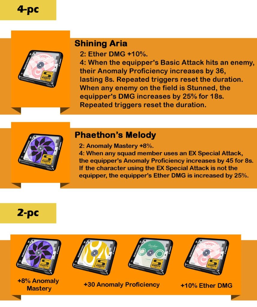 Maka dari itu, kamu bisa menggunakan Drive Disc alternatif, yakni 4-pc Phaeton’s Melody. Drive Disc ini memiliki buff dan syarat yang jauh lebih mudah dieksekusi dibandingkan Shining Aria. Kelemahannya mungkin terletak di uptime buff yang relatif singkat, sehingga butuh penyesuaian rotasi.