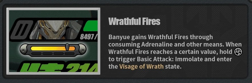 Sebelum masuk ke rincian kombo serangan, kamu perlu memahami dulu bar khusus Banyue bernama “Wrathful Fires“. Bar ini bertugas untuk mengukur, apakah Banyue bisa masuk ke mode “Visage of Wrath”, yang nantinya akan menjadi kombo terakhir dari semua kombo yang dieksekusi selama pertempuran.