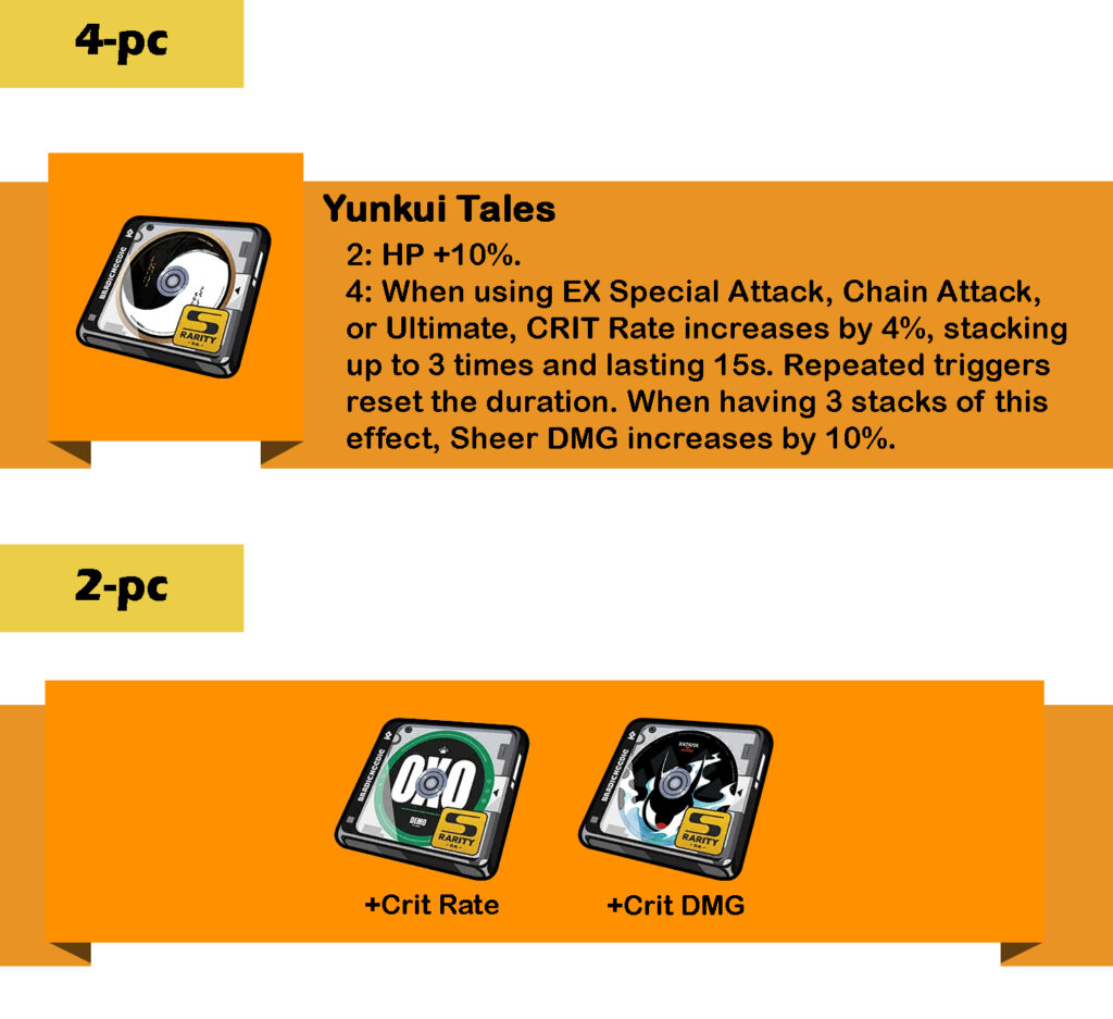 Sebagai Agent Rupture, set terbaik yang digunakan masih sama dengan Agent Rupture pendahulunya, yakni 4-pc Yunkui Tales. Set ini bakal meningkatkan HP, Sheer Force, dan Crit Rate, yang semuanya dibutuhkan untuk meningkatkan damage penggunanya.