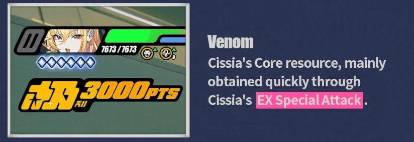 Setelah itu, Cissia mendapat 3 stack Venom, dengan bonus 1 stack per 20 energi yang dikonsumsi. Jika serangan ini mengenai musuh, maka Quick Assist juga bisa dipicu.