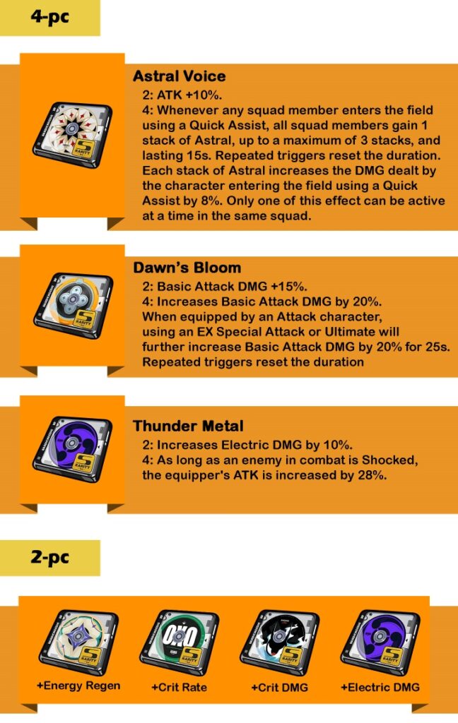 Alternatifnya adalah 4 Thunder Metal. Set ini memberikan stat Electric DMG dan ATK yang tinggi, yang bisa dipakai di semua Skill-nya dan tidak hanya terbatas di Basic ATK DMG saja.