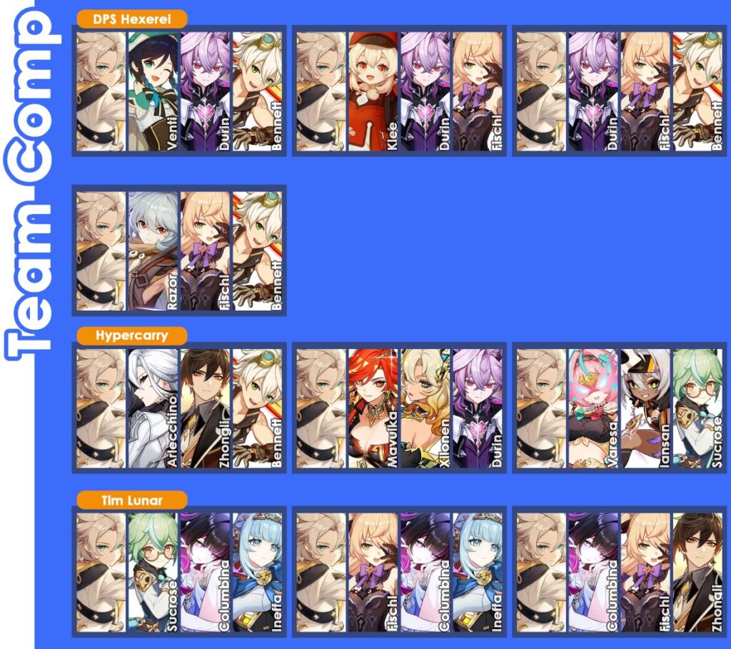 Di tim jenis ini, kamu bisa bermain Albedo di dalam tim Lunar, baik itu Lunar-Crystallize, maupun tim Lunar-Charged dengan bantuan Ineffa dan Columbina. Hanya saja, pastikan untuk mengisi setidaknya satu karakter Hexerei di dalam tim tersebut.
