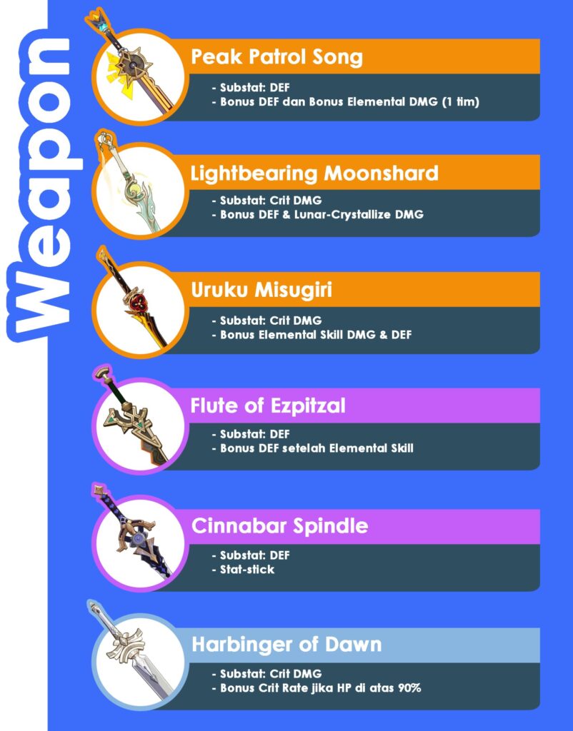 Jika menggunakan Albedo di tim Lunar-Crystallize, maka kamu bisa menggunakan Weapon Signature Zibai ini, yang bakal secara langsung meningkatkan Lunar-Crystallize DMG. Efek pasifnya juga bakal meningkatkan DEF dan substat Crit DMG akan secara langsung meningkatkan damage yang dihasilkan.