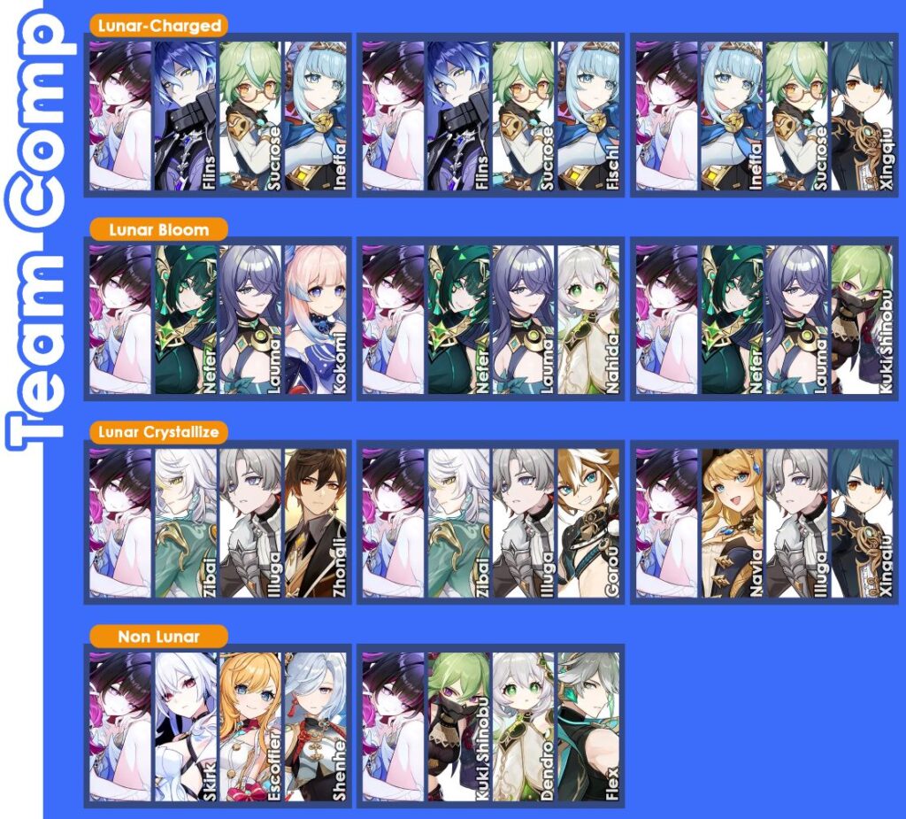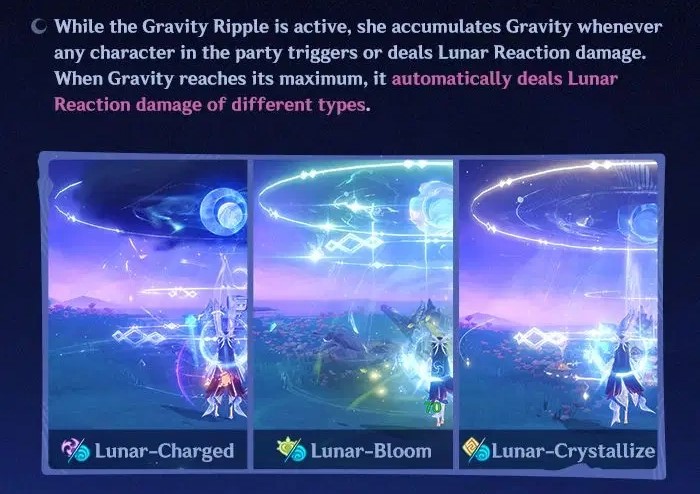Untuk tim Lunar sendiri, juga dibagi ke dalam 3 jenis berdasarkan reaksinya, yakni Lunar-Charged, Lunar-Bloom, dan Lunar Crystallize.