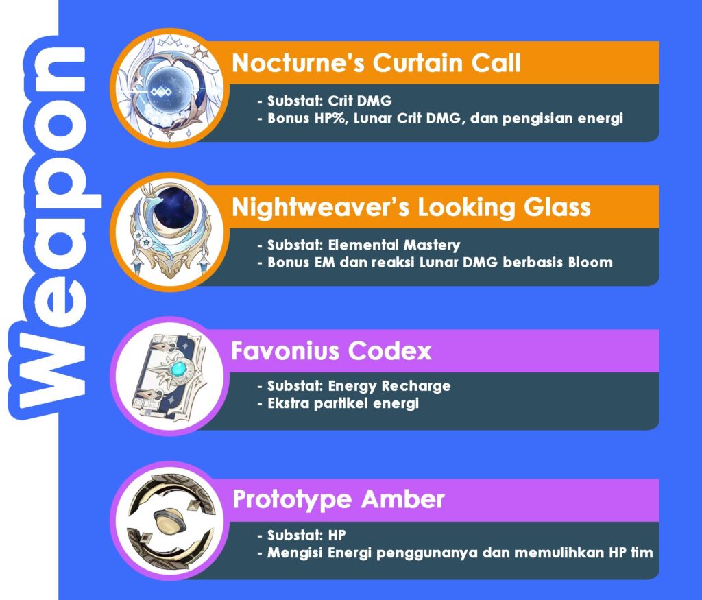 Alternatif lainnya adalah Weapon Signature dari Lauma. Jika Weapon sebelumnya bisa meningkatkan HP, maka Catalyst ini lebih meningkatkan EM. Lalu, jika kamu memainkan Columbina di tim Bloom atau Lunar-Bloom, maka Weapon ini bakal menjadi opsi terbaik berkat peningkatan Bloom DMG & Lunar-Bloom DMG yang ada di efek pasifnya.