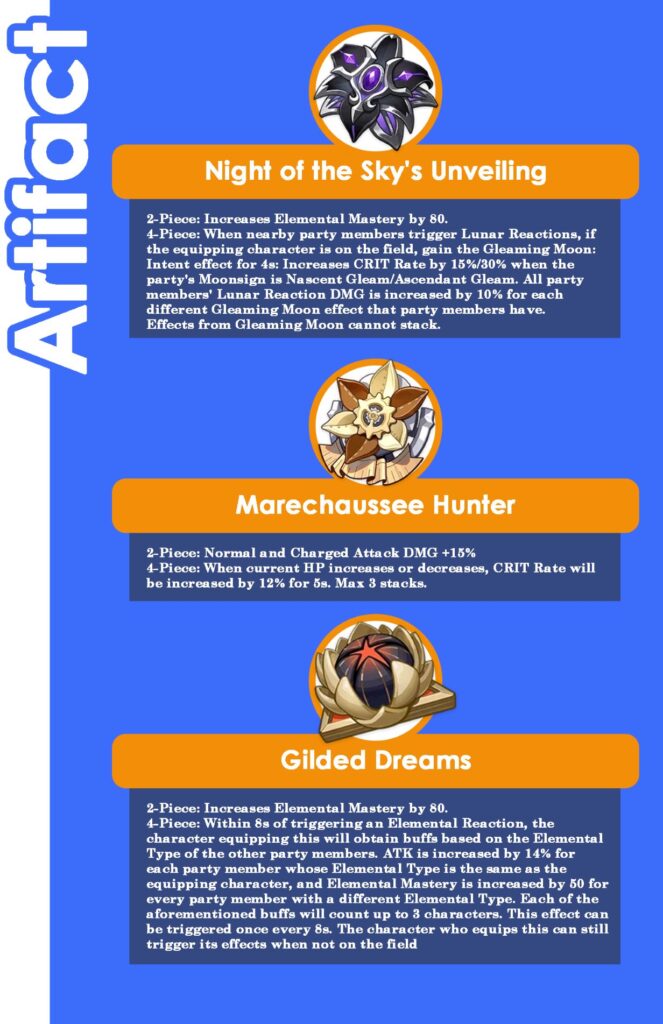 Sebagai salah satu karakter Nod-Krai pertama di dalam game, Developer sudah menyiapkan Artifact khusus baginya, yaitu 4-pc Night of the Sky’s Unveiling. Selain memberikan bonus EM di efek 2-pc-nya, ada bonus Crit Rate hingga 30% jika ada 2 karakter Nod-Krai atau lebih di dalam tim. Ada juga penambahan 10% damage reaksi Lunar untuk setiap efek Moonsign: Gleaming Moon yang aktif di dalam tim.