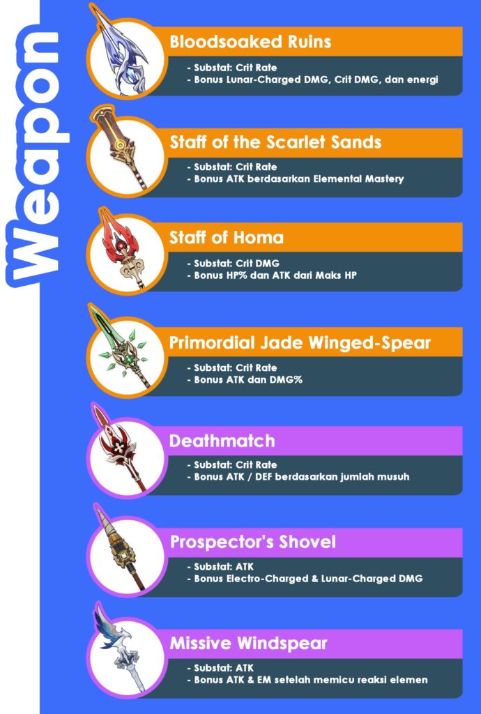 Weapon Signature miliknya ini mampu menyediakan banyak hal dalam sekali jalan, yaitu penambahan damage untuk reaksi Lunar-Charged, bonus Crit DMG, dan yang terakhir pengisian energi, yang sangat berharga untuk mempercepat aktivasi Burst-nya.