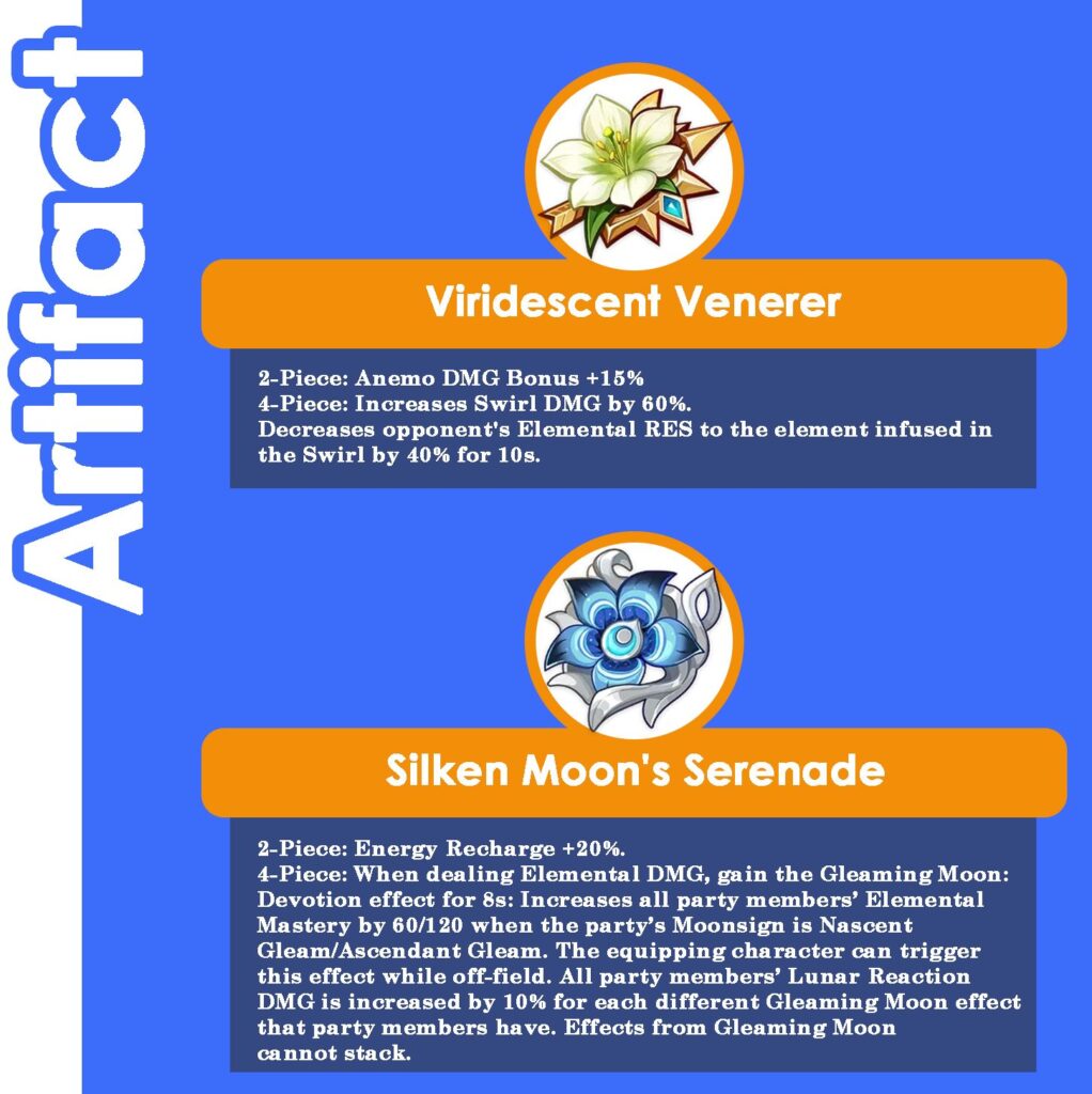Sebagai karakter Anemo, opsi yang paling sesuai tentunya adalah 4-pc Viridescent Venerer. Artifact ini selalu menjadi opsi terbaik para karakter Anemo Support, karena sanggup menurunkan RES musuh untuk elemen lain.
