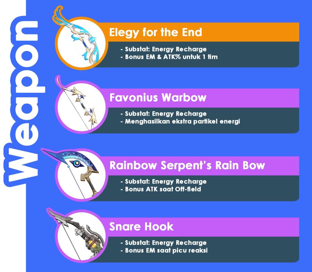 Untuk memaksimalkan aspek Support-nya, kamu bisa menggunakan Bow ini, karena bisa meningkatkan ATK dan EM karakter lain di tim. Dan dengan substat Energy Recharge, Jahoda akan lebih mudah menjaga konsistensi Elemental Burst-nya.