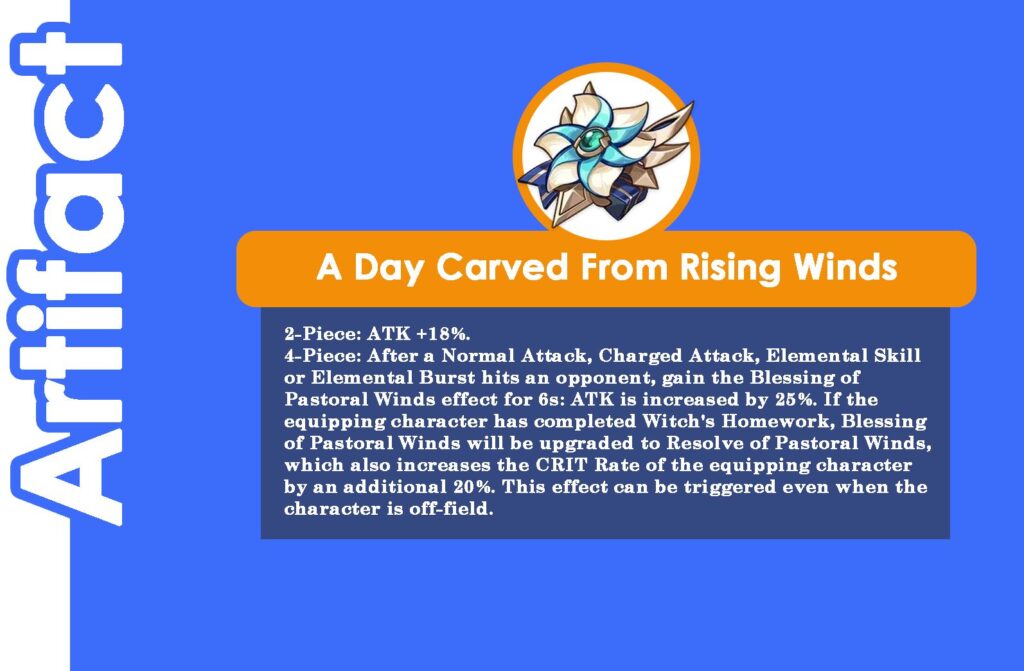 Di versi Lunar 4, ada sebuah Artifact baru bernama yang A Day Carved from Rising Winds yang didesain khusus untuk para karakter Hexerei, termasuk Klee. Artifact ini akan memberikan 43% ATK dan 20% Crit Rate. Kedua buff ini sangatlah kuat, karena juga memiliki durasi yang oke serta syarat pemicuan yang mudah.