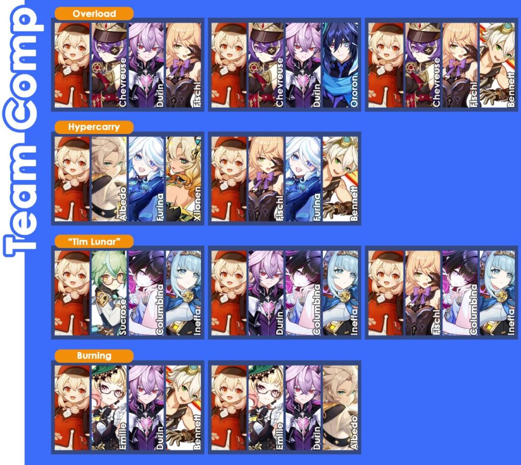Contoh karakter Hexerei yang biasa ada di tim ini adalah Durin dan Fischl. Jika kamu memilih Durin saja, maka karakter terakhir harus Electro, misalnya seperti Ororon. Tetapi jika kamu memilih Fischl, maka Durin bisa digantikan dengan Bennett atau karakter Pyro / Electro lainnya.
