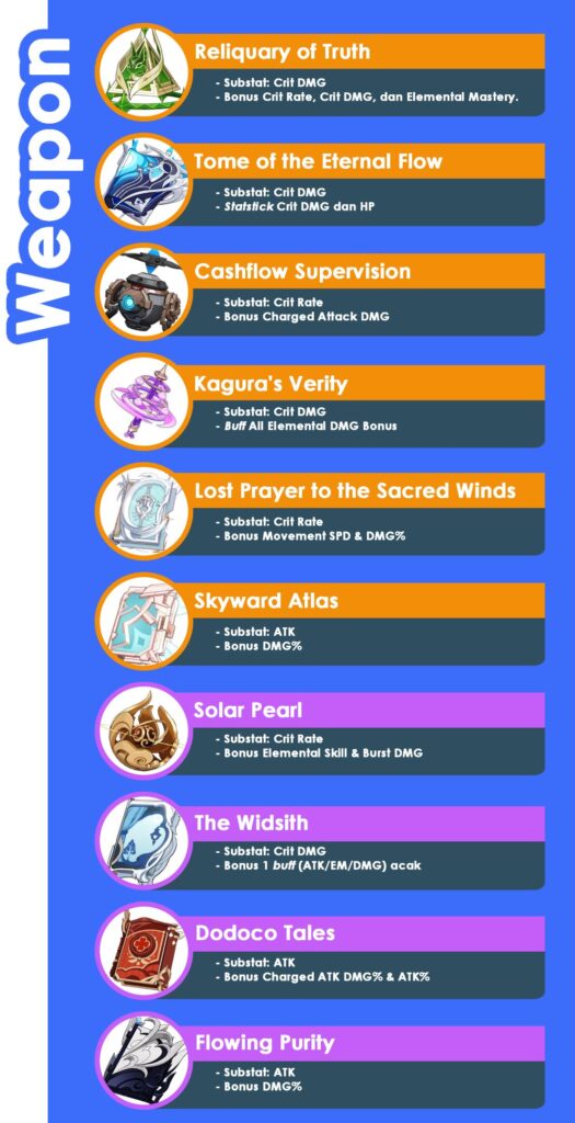 Untuk senjata terbaiknya, kamu tinggal menggunakan Catalyst B5 terbaik yang kamu miliki. Misalnya seperti Reliquary of Truth, Cashflow Supervision, Tome of the Eternal Flow, Kagura’s Verity dan tentunya 2 Catalyst dari banner standar, Lost Prayer to the Sacred Winds atau Skyward Atlas.