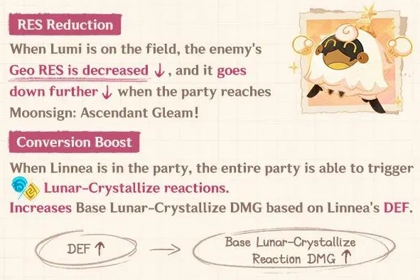 Selanjutnya, kemampuan inti dari Lumi di luar damage adalah penurunan Geo RES musuh yang ada di sekitarnya. Jika level Moonsign mencapai level 2, maka penurunan ini akan ditambah lagi.