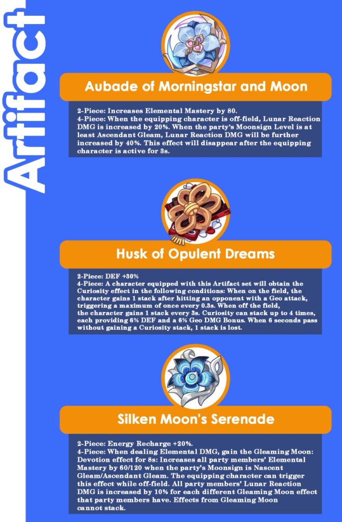 Jika ingin memaksimalkan Lunar-Crystallize DMG yang dihasilkan, maka kamu bisa menggunakan 4-pc Aubade of Morningstar and Moon yang akan langsung meningkatkan damage dari reaksi tersebut, atau 4-pc Husk of Opulent Dreams yang menyediakan bonus DEF yang cukup tinggi.