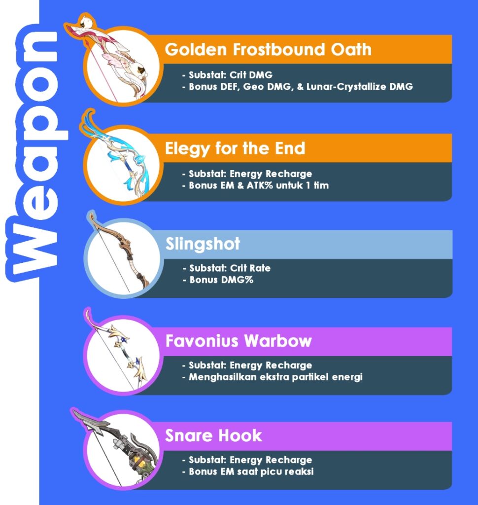 Sedangkan jika ingin menambah kemampuan buff-nya, maka kamu bisa menggunakan Bow B5 ini. Efek pasif senjata ini akan meningkatkan ATK serta DMG% untuk satu tim. Bonus ini lebih cocok ditujukan untuk karakter-karakter dengan scaling ATK atau tim di luar reaksi Lunar.