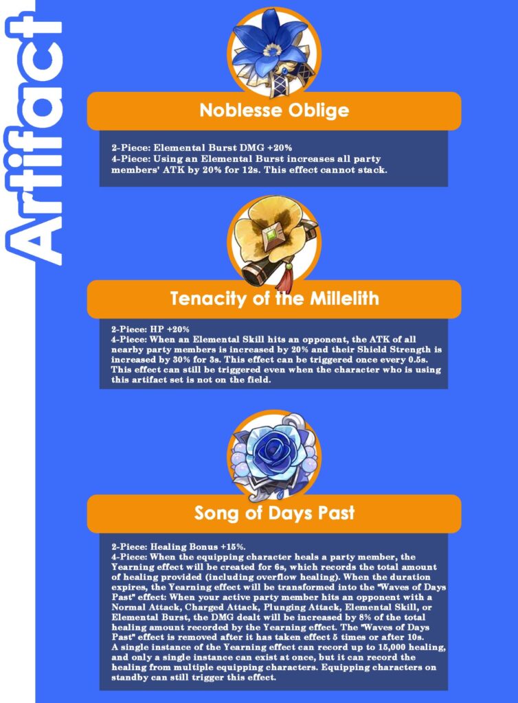 Sebagai buffer, Artifact yang paling umum dipakai adalah 4pc-Noblesse Oblige, yang akan meningkatkan ATK untuk 1 tim setelah aktivasi Elemental Burst.