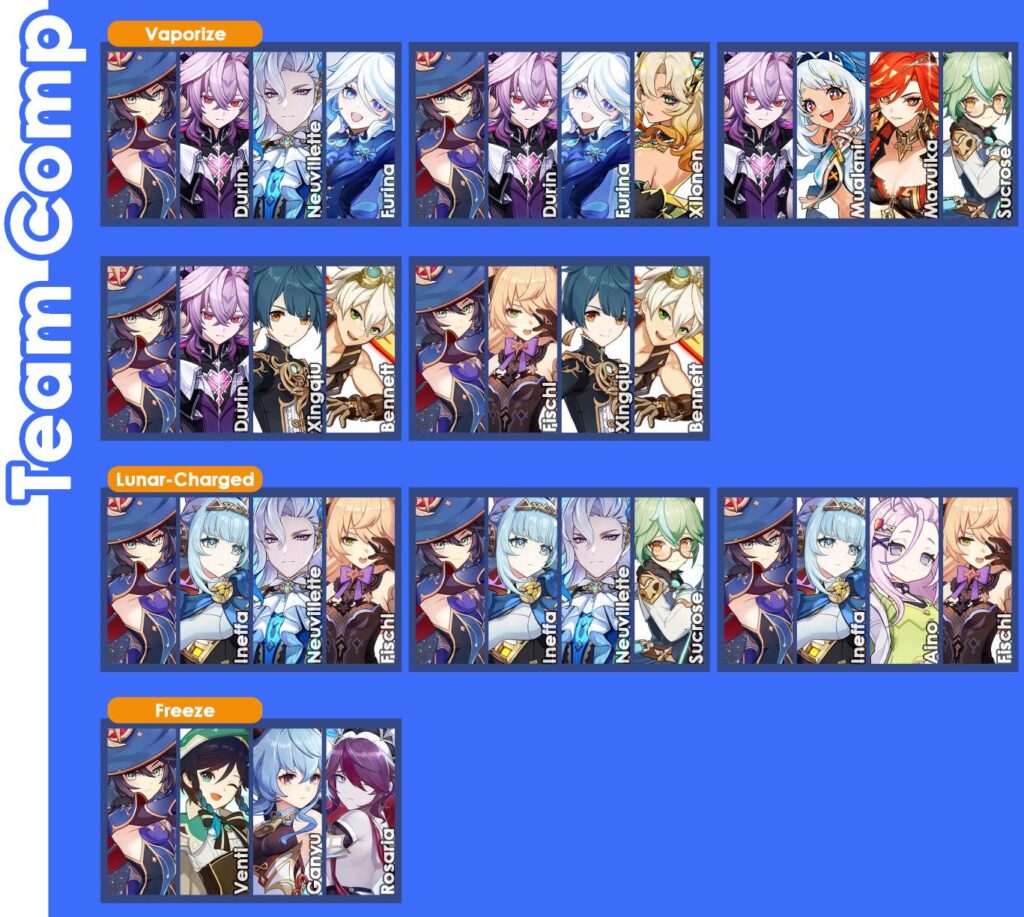 Salah satunya adalah Durin yang bisa memaksimalkan permainan DPS-nya. Di tim tersebut, karena Durin lebih bersifat sebagai DPS Off-Field, karakter pendampingnya bisa lebih fleksibel. Kamu bisa menggunakan Neuvillette, Ayato, hingga Kokomi sekalipun. Atau mungkin bermain Quick Swap bersama karakter-karakter Off-Field lain, seperti Furina, Albedo, Fischl (menjadi OverVape), atau mungkin menambah karakter Support seperti Xilonen, Kazuha, Bennett, dlsb.
