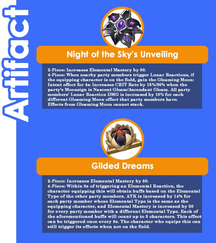 Tapi mengingat set tersebut baru dirilis di versi Luna 1, maka belum tentu semua pemain sudah mendapatkan set dengan stat yang memuaskan. Oleh sebab itu, kamu bisa menggunakan 4-pc Gilded Dreams, yang bisa meningkatkan EM penggunanya dengan cukup signifikan, sembari mencari Artifact Nod-Krai dengan stat yang lebih memuaskan.