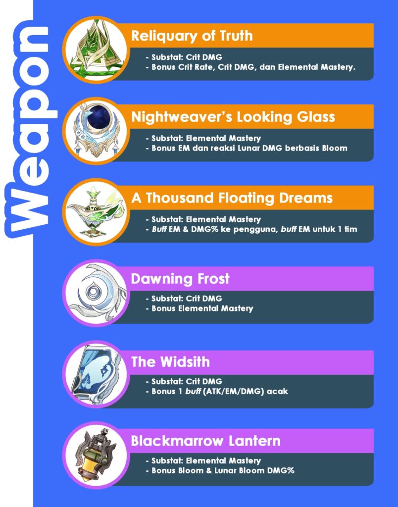 Meski performa Weapon Signature yang cukup jauh, namun masih ada sejumlah opsi yang membuat Nefer masih bisa beraksi dengan baik. Salah satunya adalah Weapon Signature dari Lauma. Senjata ini lebih meningkatkan stat EM dan Lunar-Bloom DMG ketimbang memberikan raw stat dari Weapon Signature Nefer sebelumnya.