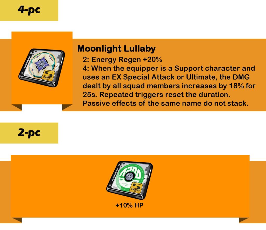 Set terbaik yang bisa Lucia pakai adalah 4-pc Moonlight Lullaby, yang hingga versi 2.3, menjadi set terbaik untuk sebagian besar Agent Support. Set ini akan memberikan 18% DMG selama 25 detik, hanya dengan menggunakan EX Special ATK atau Ultimate. Durasi dan syarat yang sangat mudah ini membuat uptime-nya akan sangat mudah dijaga.