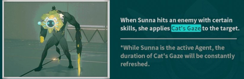 Jika ada Agent Attack atau Anomaly menyerang musuh yang terkena “Cat’s Gaze”, maka debuff ini akan dikonsumsi dan memberikan Additional DMG, yang dihitung berdasarkan ATK mereka. Damage ini akan mendapatkan 100% Crit Rate dan 80% Crit DMG.
