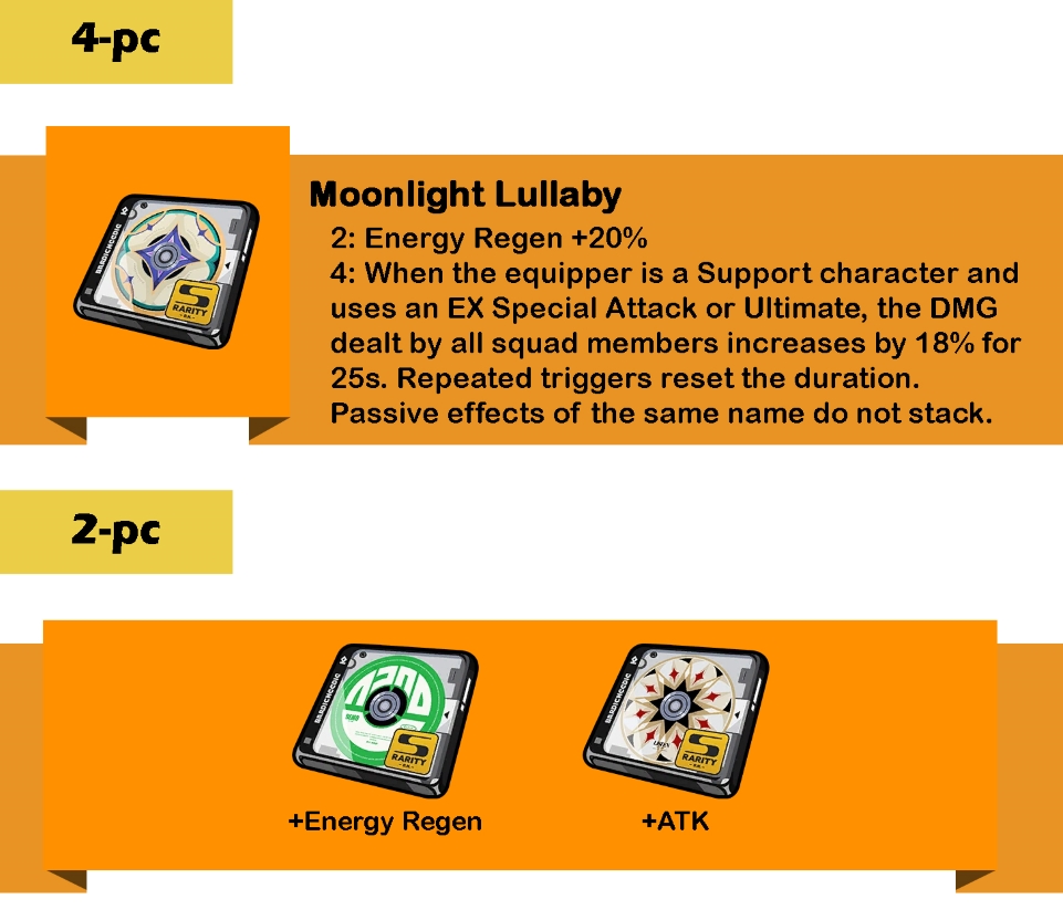 Drive Disc paling cocok dengan permainan Sunna adalah 4-pc Moonlight Lullaby. Set ini didesain untuk Agent Support, yang memberikan buff tambahan setelah mereka mengaktifkan EX Special ATK atau Ultimate. Bonus Energy Regen juga cukup membantu memenuhi kebutuhan energinya.