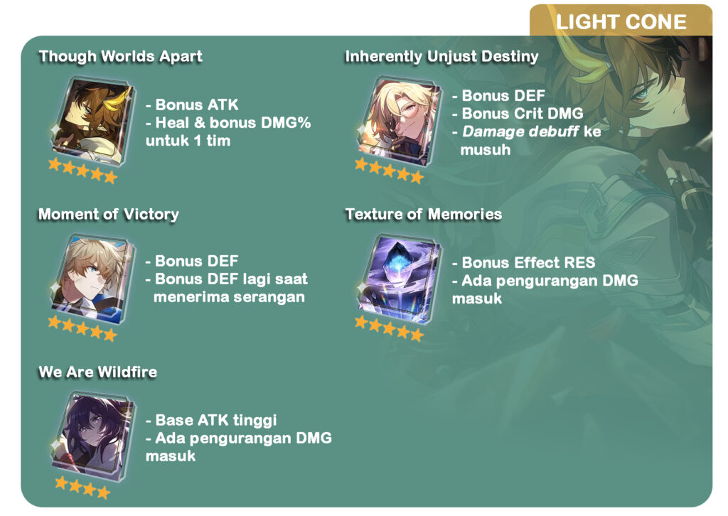 Pilihan lain lagi yang bisa dipakai adalah Light Cone Gepard ini. Meskipun efek pasifnya tidak terlalu cocok dengan kebutuhannya, namun setidaknya Light Cone ini memiliki base ATK tertinggi kedua setelah Light Cone Signature-nya.