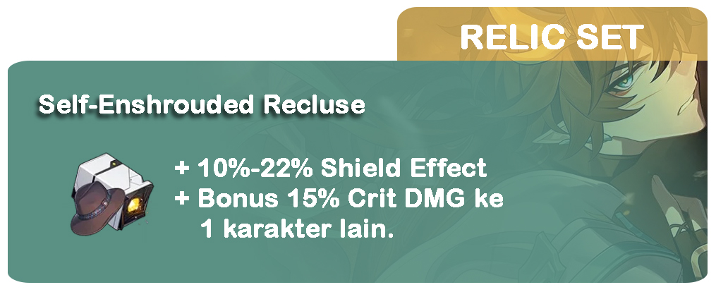Relic paling optimalnya bisa kamu temukan di set ini, karena Developer telah merancang sebuah Relic Set yang sangat cocok dengan permainan dan kebutuhannya. Relic ini akan menambah ketebalan Shield, sekaligus menambah Crit DMG untuk 1 tim. Aspek buff yang kedua tadi membuatnya lebih cocok di dalam tim dengan DPS Hypercarry.