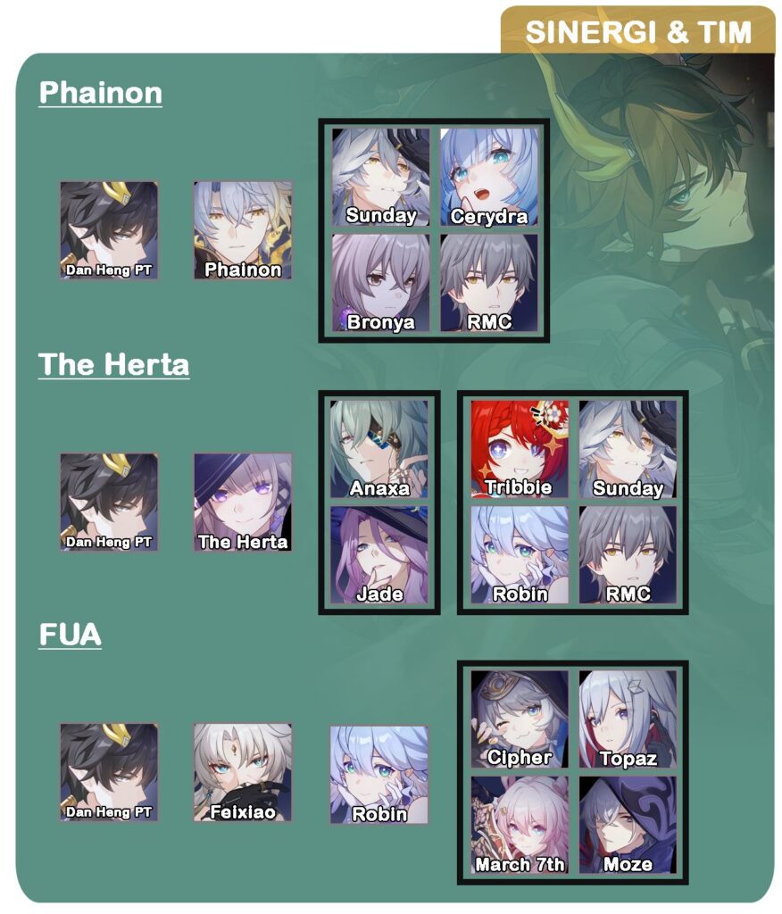 Pada dasarnya, Dan Heng PT bisa diletakkan di tim mana saja, selama tim tersebut membutuhkan karakter Sustain. Tapi karena dia memiliki buff ATK, maka dia lebih cocok dengan DPS ber-scaling ATK.