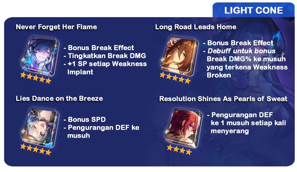 Untuk opsi B4-nya, Light Cone Resolution bisa kamu pakai, untuk mendapatkan tambahan kemampuan pengurangan DEF. Pastikan juga untuk mendapatkan setidaknya 67% Effect Hit Rate untuk menjamin terpicu-nya debuff ke musuh.