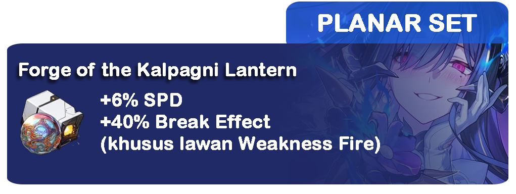 Sama seperti Relic-nya, pasangan Planar Set untuk karakter-karakter Super Break adalah Planar Kalpagni. Planar Set ini meringankan kebutuhan SPD dan Break Effect secara bersamaan.