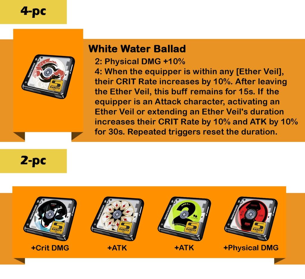 Bersamaan dengan perilisannya, sebuah Drive Disc baru bernama 4-pc White Water Ballad juga telah Developer siapkan untuk memaksimalkan damage yang dia hasilkan. Set ini bakal meningkatkan Physical DMG Bonus, 10% ATK, serta Crit Rate hingga 20%.
