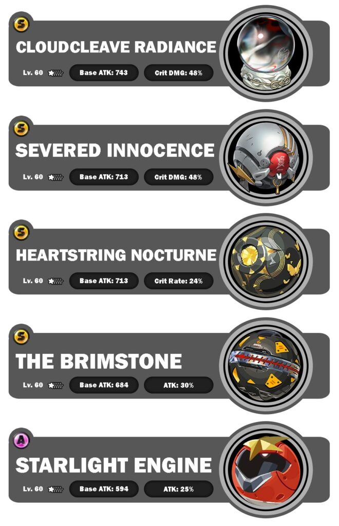 Selebihnya kamu tinggal menggunakan W-Engine S-Rank terbaik yang kamu miliki, khususnya yang bisa meningkatkan Crit DMG atau ATK%. Hal ini disebabkan karena bonus Crit Rate yang sangat tinggi dari skillkit Ye Shunguang serta Drive Disc-nya.