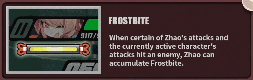Permainan Zhao bakal bertumpu di bar khusus bernama “Frostbite” (maks. 100 poin). Ketika penuh, Zhao bisa mengaktifkan efek “Ether Veil”, yang juga mengaktifkan semua buff yang dia punya untuk Agent lain.