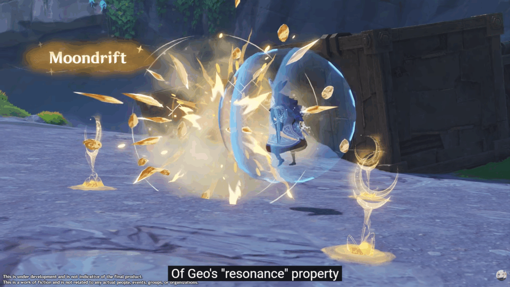 Reaksi ini tidak menghasilkan Shield, melainkan sebuah 3 objek di titik reaksi terpicu. Lalu, objek-objek ini bakal menembakkan serangan Geo ke arah musuh. Objek ini juga akan dianggap sebagai Geo Construct, sehingga bisa dimanfaatkan oleh karakter-karakter Geo lain, misalnya seperti Zhongli dan Chiori.