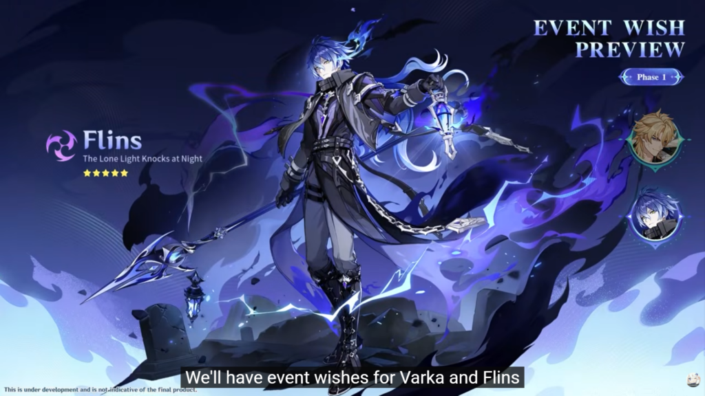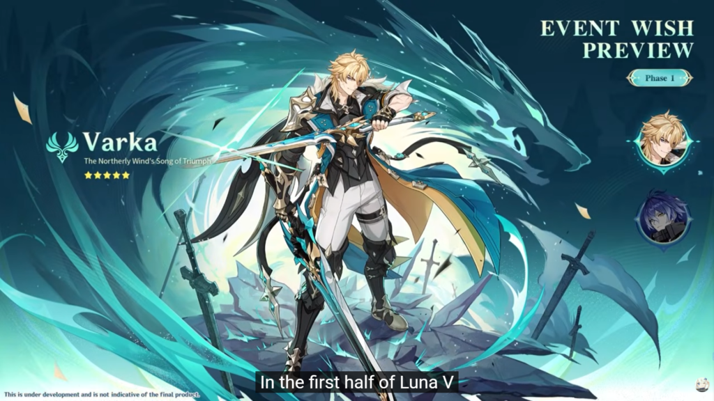 Varka adalah karakter B5 Anemo Claymore yang bakal memulai debutnya di versi ini. Pada dasarnya, dia memiliki gameplay sebagai penghasil damage utama, yang memanfaatkan serangan Anemo dan satu elemen lagi yang diserapnya. Hal ini membuatnya bisa menghasilkan dua jenis damage dalam satu waktu, yang membuat permainannya cukup variatif.