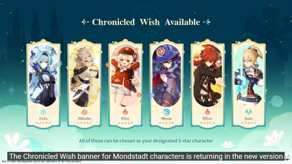 Chronicled Banner hadir kembali setelah sekian lama absen. Kali ini, Banner tematik ini bakal kembali ke Mondstadt, dan menghadirkan sejumlah karakter asal Mondstadt, baik itu karakter standar maupun limited. Tidak hanya karakter, pemain juga bisa mendapatkan Weapon B5 yang sesuai dengan keinginan mereka.