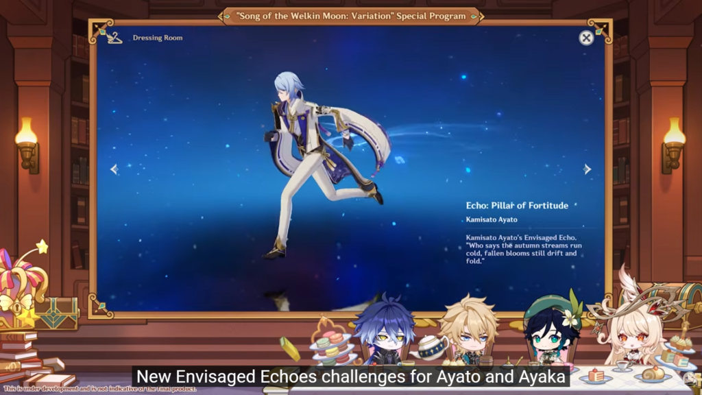 Yang terakhir adalah penambahan Envisaged Echoes baru untuk 2 karakter asal Inazuma, yakni Kamisato Ayato dan Ayaka. Item ini bisa pemain dapatkan setelah menyelesaikan tantangan yang diberikan khusus untuk karakter tersebut. Ketika digunakan, Item ini bakal menambahkan efek visual ketika karakter aktif sedang berlari.