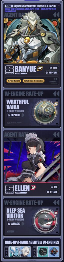 Di ZZZ versi 2.4 ini, terdapat 4 karakter yang mendapatkan rate-up. Keempatnya bakal dibagi ke dalam 2 fase, yang masing-masing berdurasi selama 3 minggu. Berikut ini semua karakter tersebut: