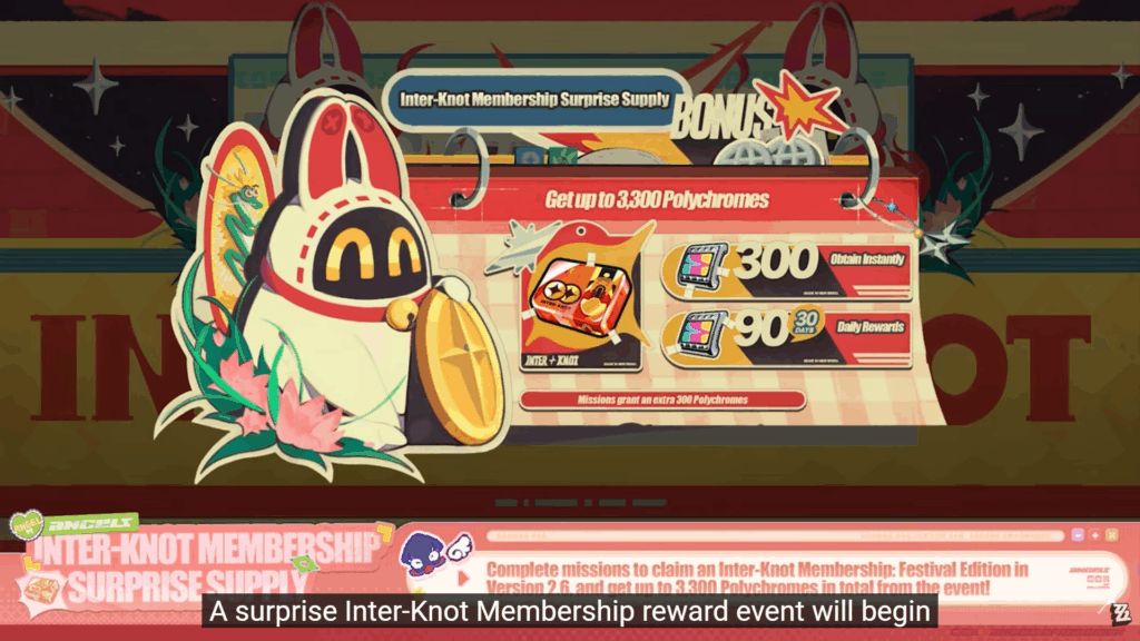 Untuk merayakan Tahun Baru Imlek, Developer ZZZ memberikan kejutan hadiah kepada semua pemain berupa sebuah Inter-Knot Membership secara gratis. Hal ini akan memberikan pemain Polychrome secara bertahap selama 1 bulan, dengan total 3300 Polychrome. Event ini akan dimulai pada tanggal 30 Januari 2026.