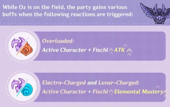 - Jika ada reaksi Electro-Charged atau Lunar-Charged terpicu, +90 Elemental Mastery untuk Fischl dan karakter aktif selama 10 detik.