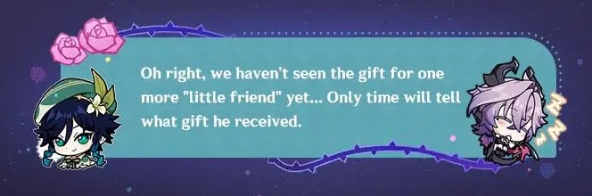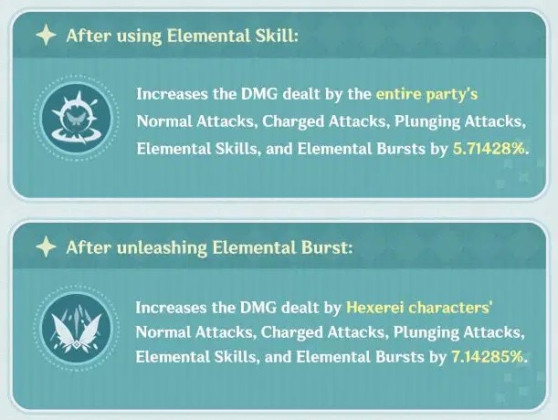 - Setelah mengaktifkan Elemental Skill, +5.71428% DMG untuk Normal ATK, Charged ATK, Plunge ATK, Elemental Skill, dan Elemental Burst dari satu tim selama 15 detik.