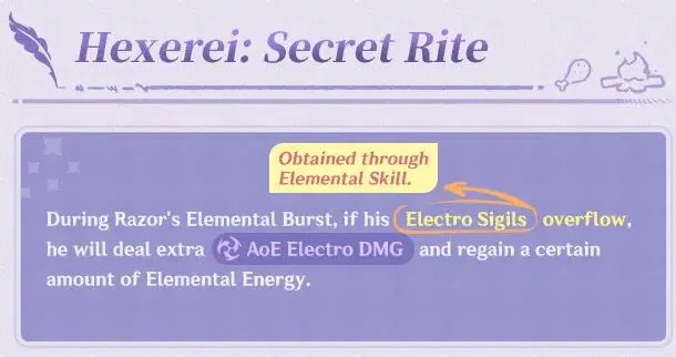 - Selama Elemental Burst-nya aktif, jika Electro Sigil dari Elemental Skill-nya berlebih, maka akan ada serangan Electro yang menyasar ke musuh terdekat, lalu Razor mendapatkan 7 energi. Efek ini bisa terpicu per 1 detik sekali.